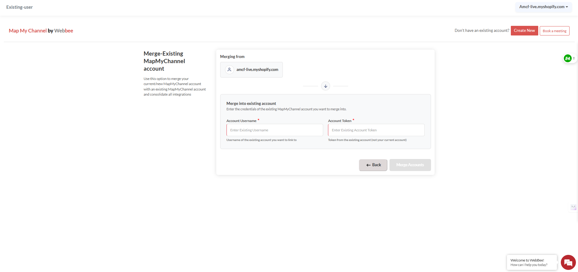During onboarding, you can choose whether to merge your existing MapMyChannel account with your Shopify account or keep them separate. This decision is entirely up to you. Keeping the accounts separate will result in charges for two accounts, while merging them into a single account will result in billing for only one account. To merge your existing MapMyChannel account with the Shopify MapMyChannel account, you will need to enter your existing account username and account token; please see the image below. Once done, the rest of the onboarding is similar to the new user setup.