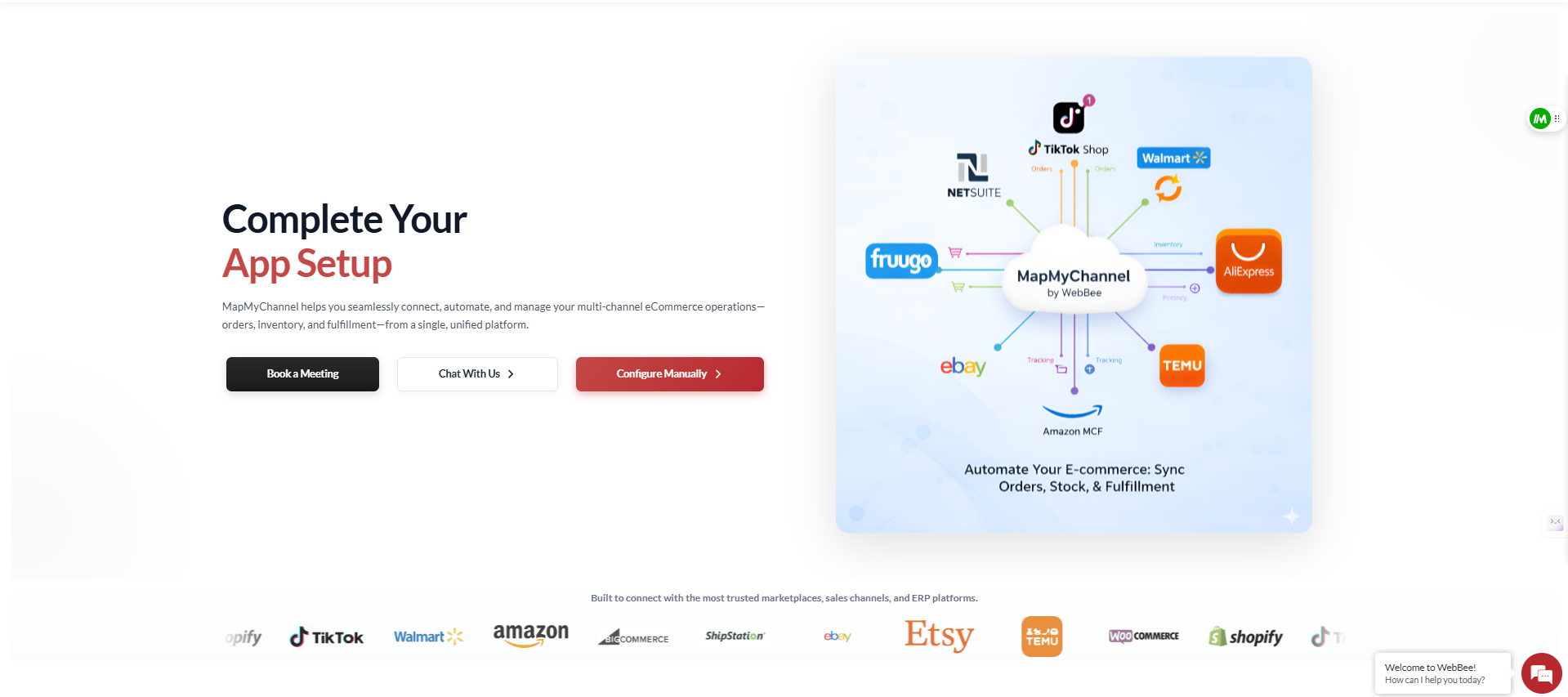 Once you have successfully finished with the app installation, it's now time to complete the onboarding. On the first page (Complete your app setup), it shows you three options: "Book a meeting," "Chat with us," and "Configure manually." If you feel the need for a dedicated person to help you in your app onboarding, you can book a meeting with the Webbee team, or you can have a chat session; otherwise, click on the configure manually button.