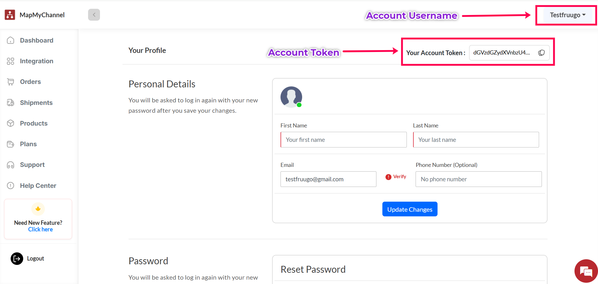To obtain your "Account Username" and "Account Access Token," navigate to the Profile page in your existing MapMyChannel account and select Settings. Copy and paste the access token & account username into the "Merge existing MapMyChannel account" onboarding page (Shopify).