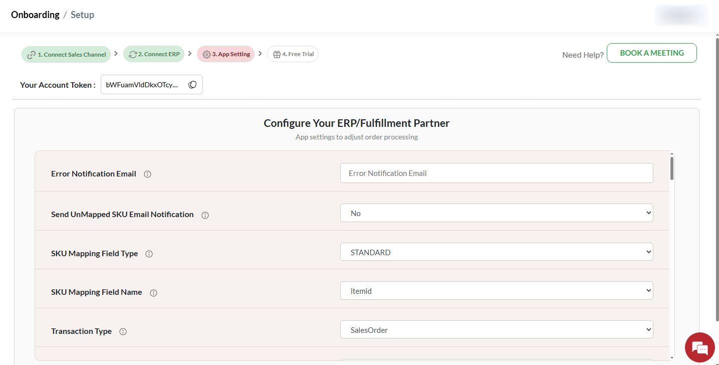 Step 3: After a successful ERP connection, the next page will ask you to configure the app settings so that your order sync works smoothly.