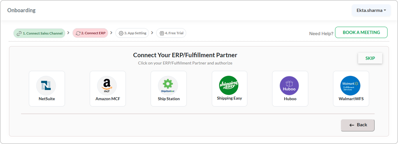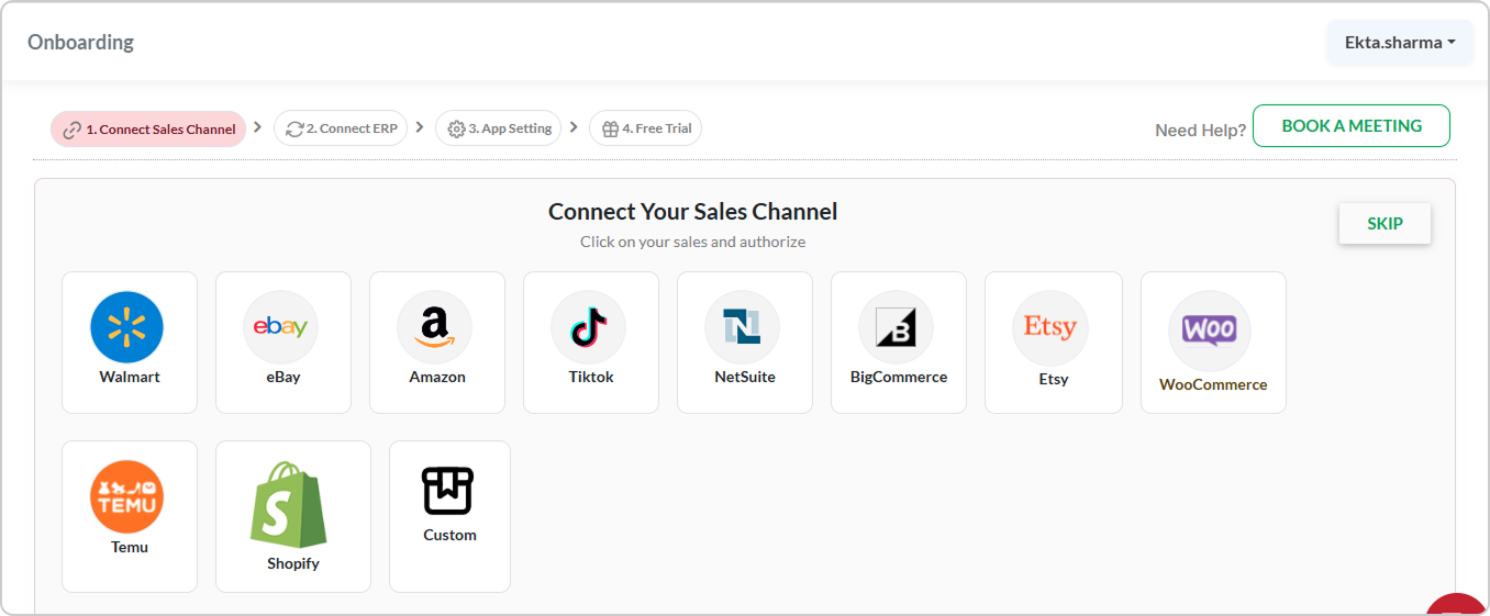 A: Yes, onboarding can be skipped. You can always connect sales channels, ERP/fulfillment partners, and update configurations later.