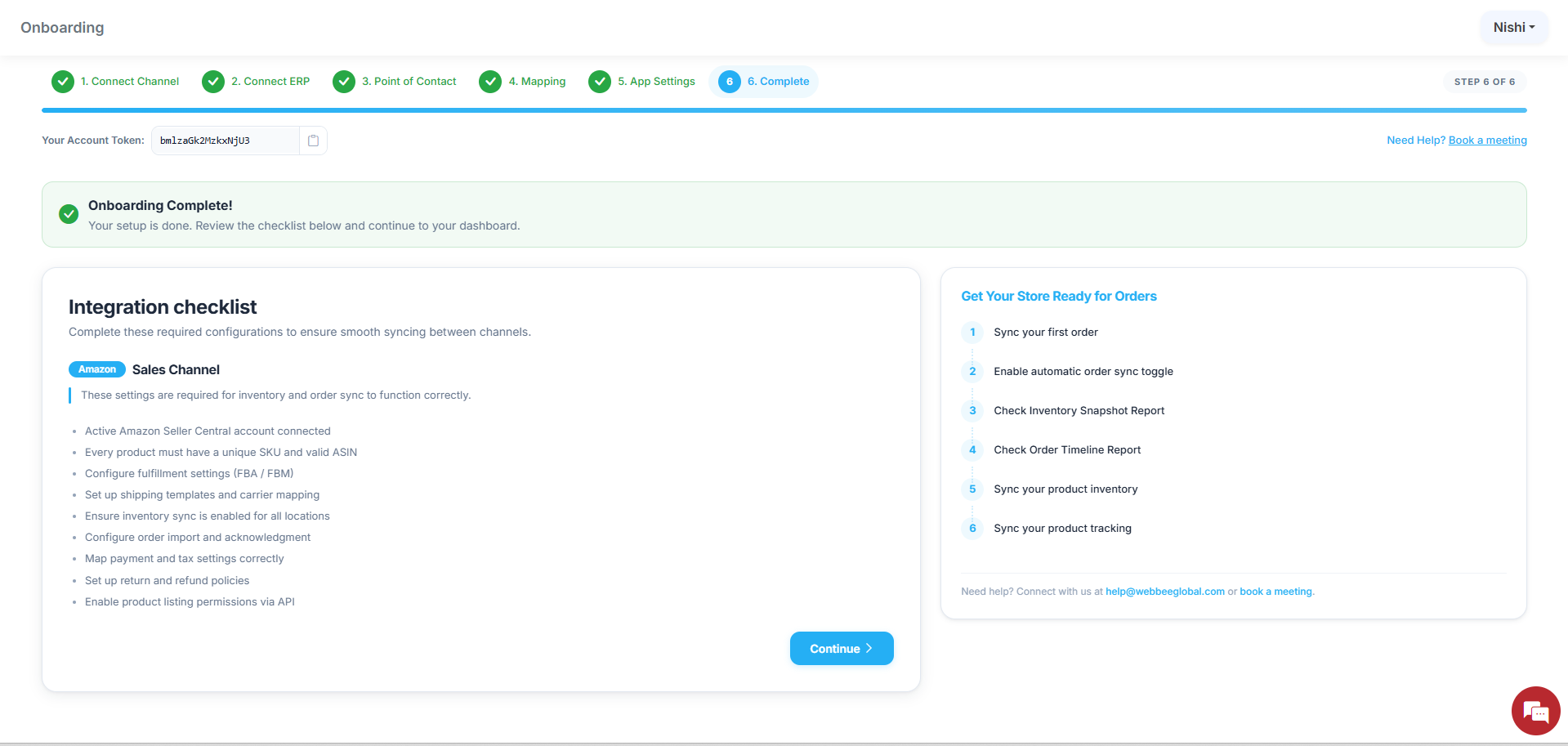 This page provides a checklist of essential configurations that sellers must complete to ensure smooth operation of the integration between their sales channel and ERP or fulfillment partner for order, inventory, and tracking synchronization. It also acts as the final step of the onboarding process, guiding sellers on the next steps needed to begin processing real-time updates for orders, inventory, and tracking, ensuring the integration runs effectively. After completing this page, you will be redirected to the app dashboard.