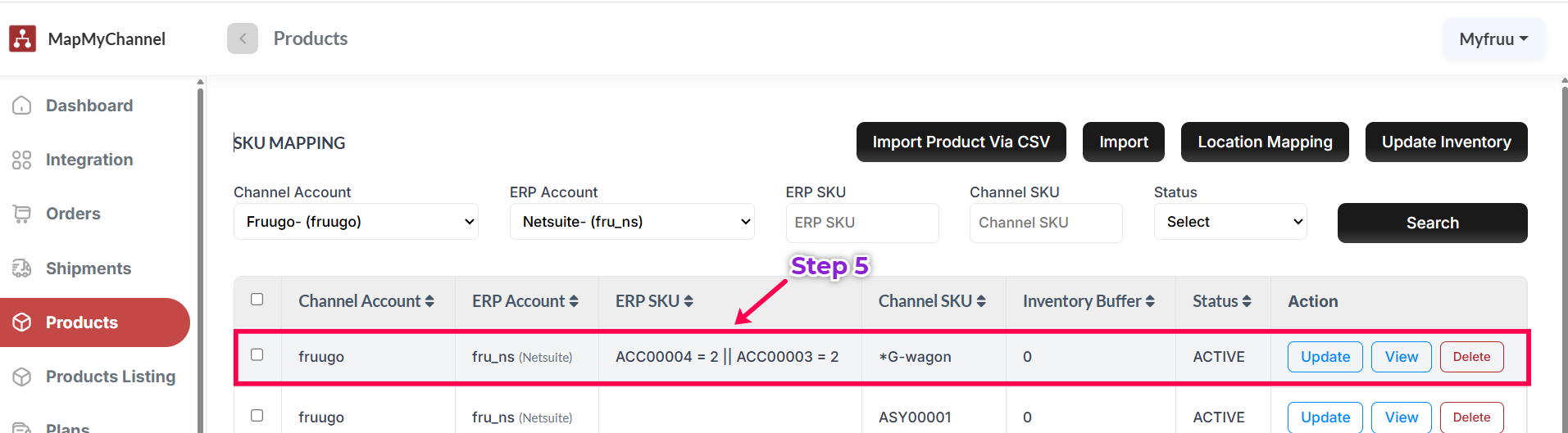 Update button: opens the mapping details screen to change ERP SKU, Channel SKU, inventory buffer, or status.